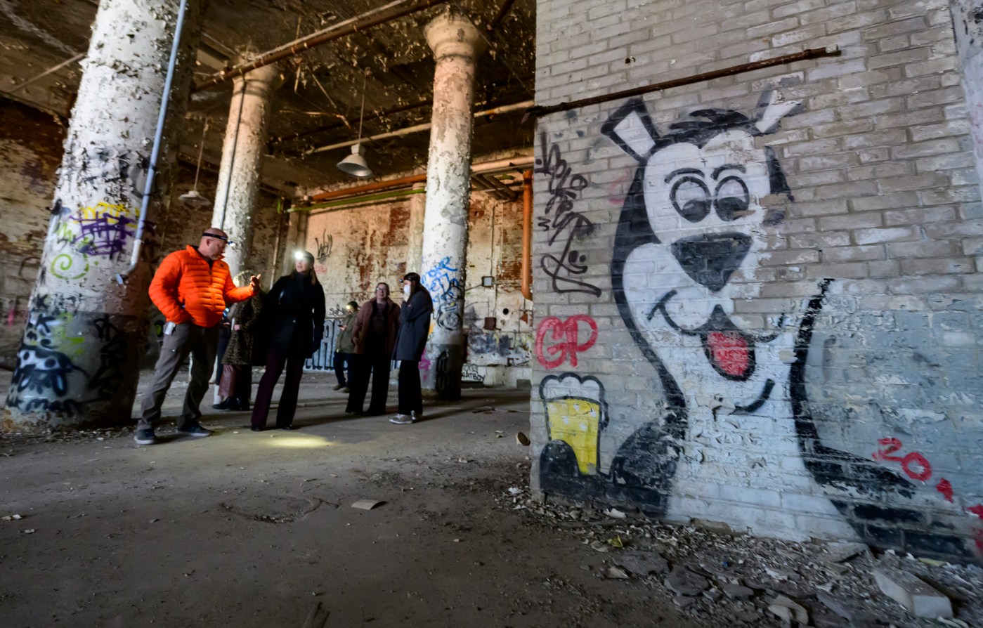 Ashley Bisner, left, a vice-president for development with JB Vang real estate development company, leads a tour for city and neighborhood officials on Tuesday, Nov. 18, 2025 of the century-old Hamm’s Brewery campus, including the brewery’s graffiti-strewn stock house and laboratory, two multi-story buildings slated to be reinvented as artist-style housing attached to commerce — 86 affordable lofts adjoining a multi-story indoor marketplace. (John Autey / Pioneer Press)