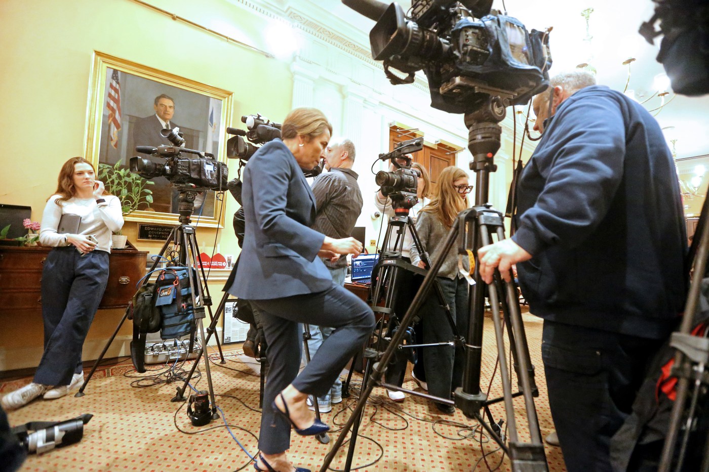 Gov. Maura Healey was holding the press conference outside her office, calling on President Donald Trump to release Low Income Energy Assistance Program (LIHEAP) funding immediately, when she was interrupted mid-speech by a loud thud followed by collective gasps. At first, there was confusion among reporters and elected officials alike, with many concluding that someone standing way in the back of the room, behind all the cameras, reporters and equipment, had fainted — hitting the ground hard enough to stop the entire event.