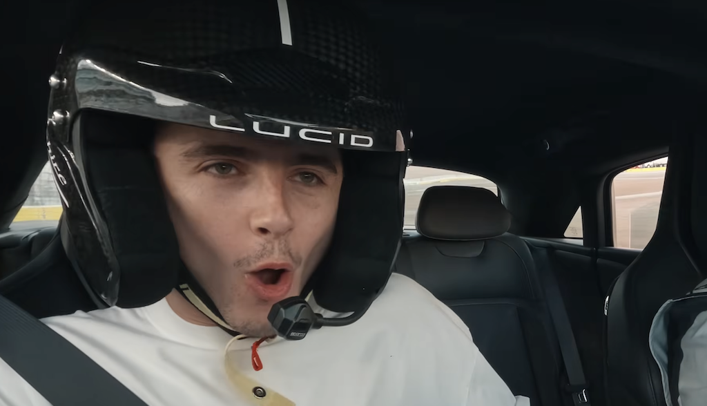 There is a special kind of chaos in Lucid’s new Hard Launch video, the kind that happens when you mix a 1,234 horsepower Lucid Air Sapphire, a pro driver, and rapid fire questions about greatness. Timothée Chalamet rides shotgun at Las Vegas Motor Speedway while Ben Collins, the former Stig himself, hurls the car from 0 to 60 in a claimed 1.89 seconds. On a screen in front of him, Knicks teammates Josh Hart and Jalen Brunson pepper him with everything from career philosophy to who deserves the title of greatest in different categories, all while the Sapphire rockets down the straight.