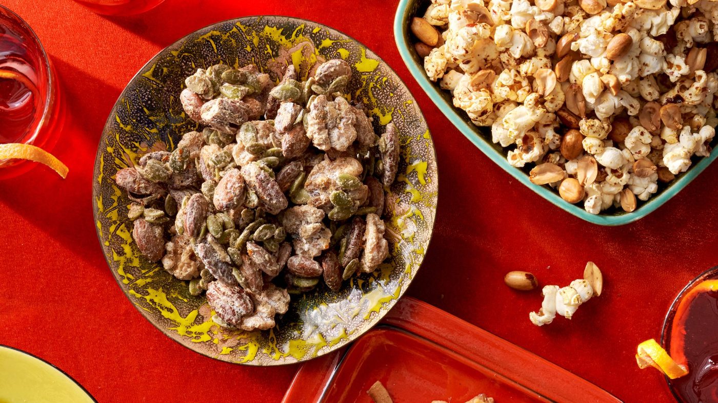 This second leans more savory, featuring nuts enlivened with citrus, sage, fennel and cumin, and delicately held together with whipped egg whites, for a headier, more sophisticated snack bowl you might see on the bar. Large nuts such as pecans, walnuts and cashews work best, and seeds such as pumpkin, sesame or even flaxseeds can fill the spaces in between. When gently baked in a low temperature oven, this mix will release a fragrant parade, marching through to fill your kitchen and home with its scent.