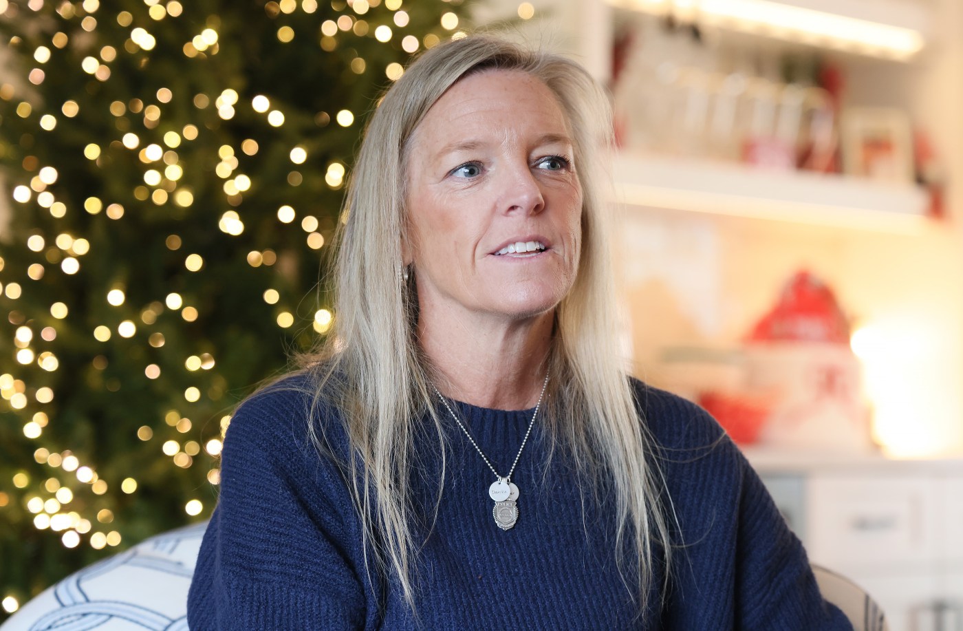 Officer Kristin Tracey, the widow of Waltham police officer Paul Tracey, wears a necklace of her husband’s shield and her children’s names. (Nancy Lane/Boston Herald)