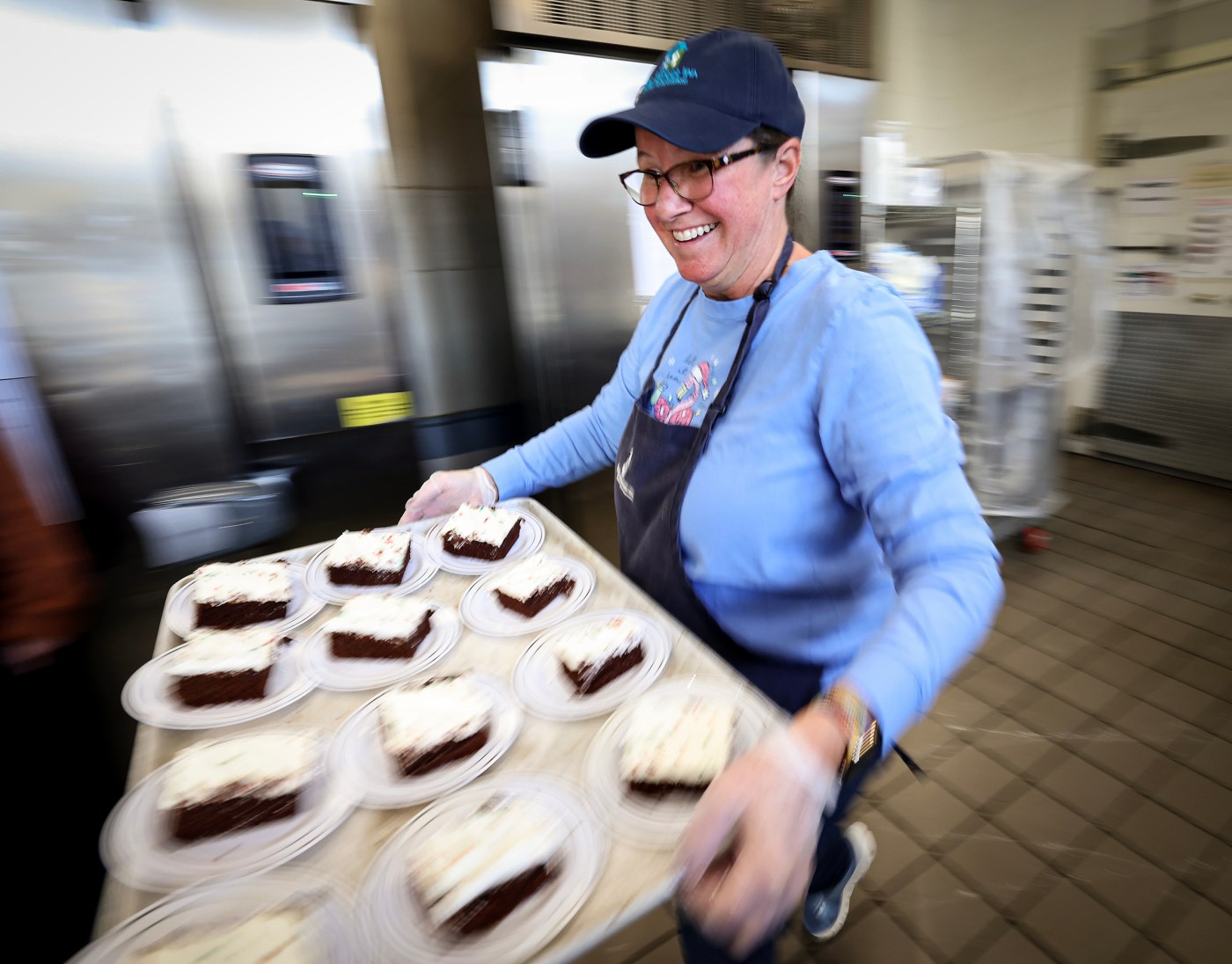 Volunteer Jorge Vejiga scoops fruit salad bowls in the kitchen of Pine Street Inn on Christmas Eve. (Mark Stockwell/Boston Herald)