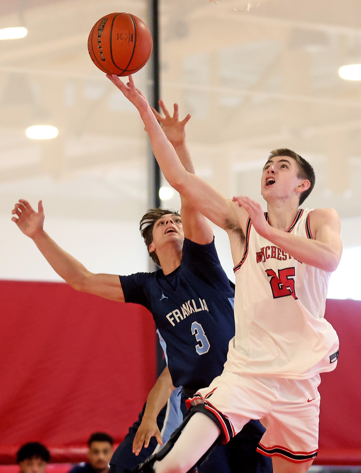 Franklin’s only leads came in the first quarter, as Santos knocked down a 3-pointer to go up, 3-2, and Jack Sullivan (nine points) drained another to go up 6-4. Burbine put Winchester ahead for good with a layup late in the first, capping a possession in which two teammates leaped out of bounds to keep the ball in play. A layup by Dawson English (15 points) made it 22-13 Winchester heading into halftime.