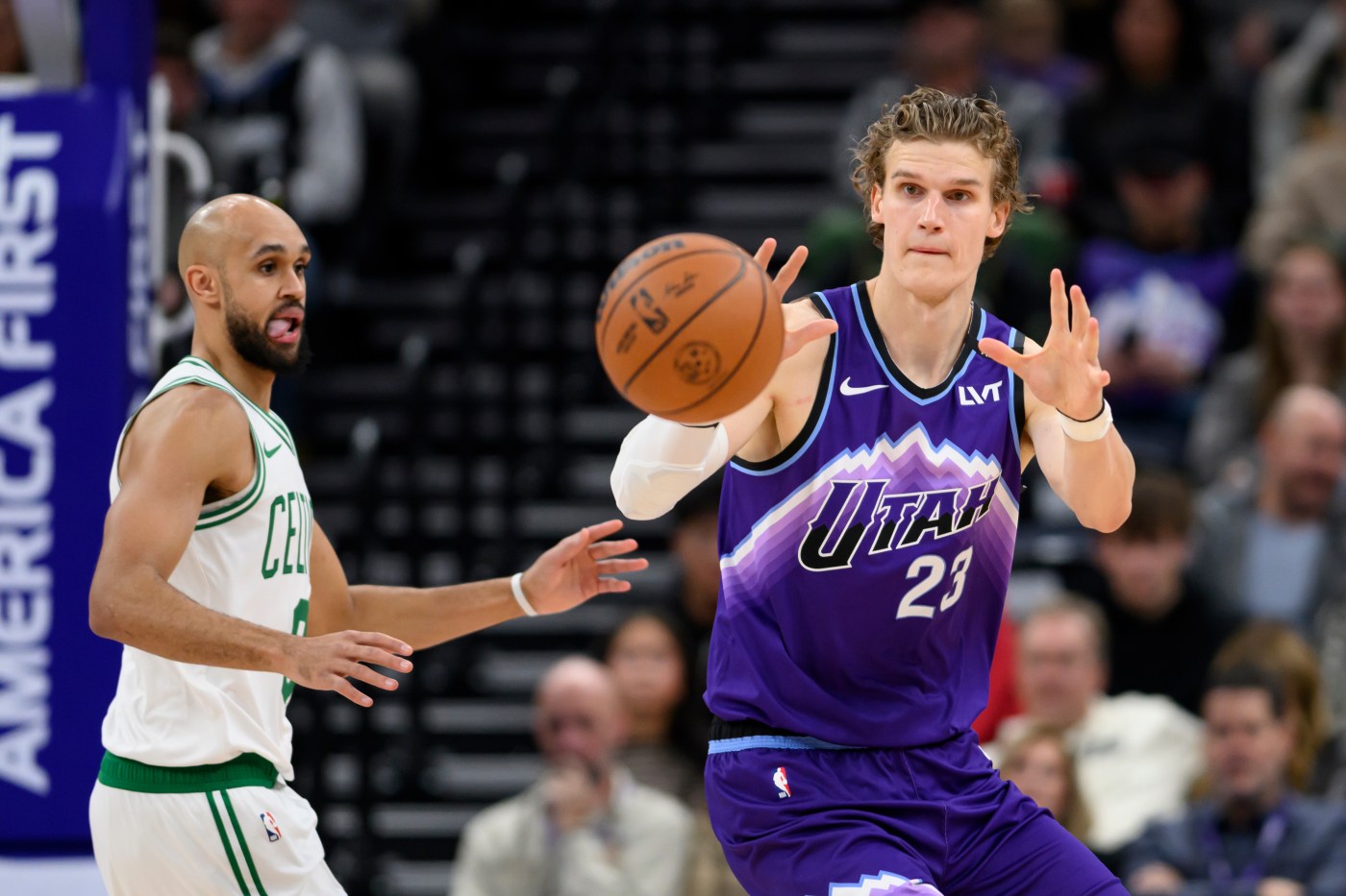 First quarter, 8:37: Markkanen again. This time, the 7-foot-1 Utah star tries to drive past the 6-foot-4 White in transition. But a lane to the rim never opens. White backpedals for five steps from the 3-point arc to the restricted area — narrowly missing Jaylen Brown’s right foot on one — before elevating to deny Markkanen’s layup.
