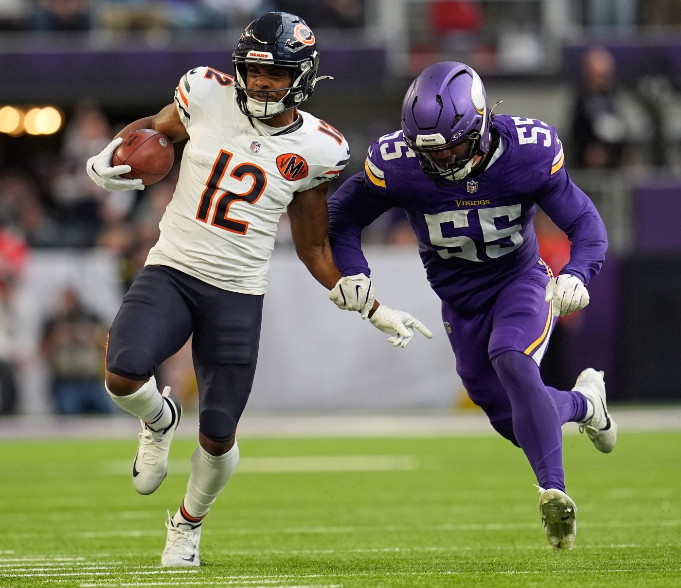 Chicago Bears wide receiver Devin Duvernay (12) leaves the field after an NFL football game against the Minnesota Vikings, Sunday, Nov. 16, 2025, in Minneapolis. (AP Photo/Abbie Parr)