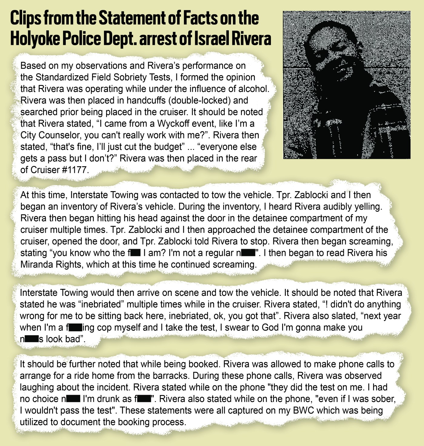 “During these phone calls,” Trooper Daniel Harpin Jr. wrote, “Rivera was observed laughing about the incident. Rivera stated while on the phone, ‘They did the test on me. I had no choice (n-word). I’m drunk as (f-word).”