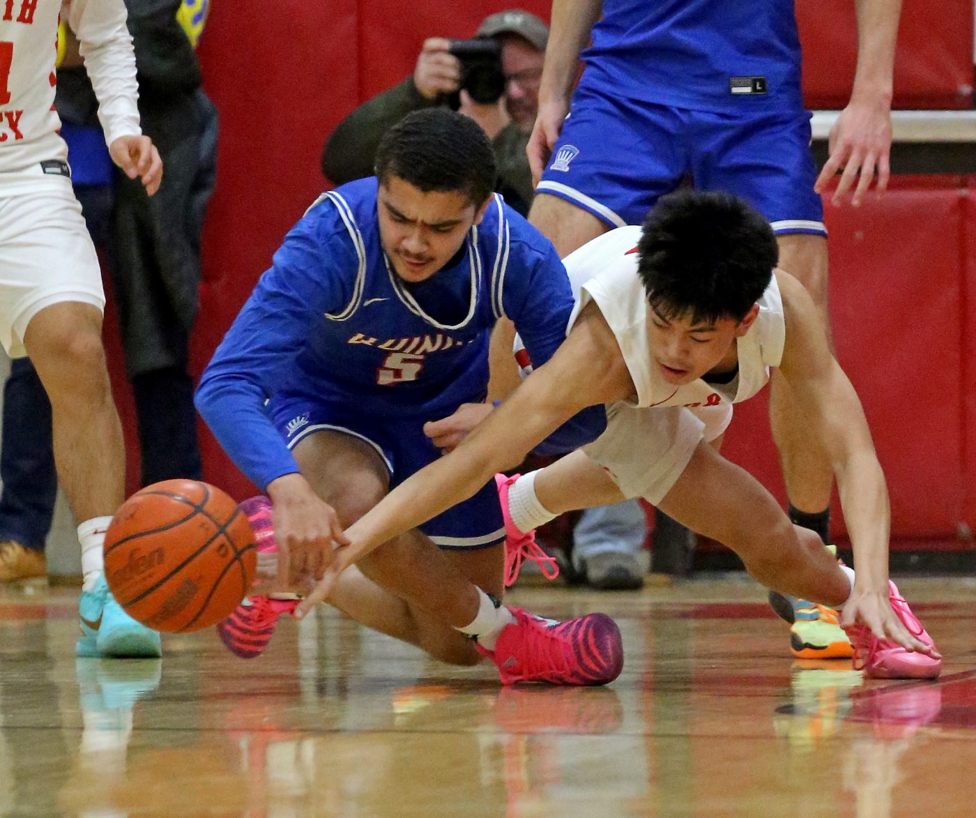 Quincy’s Sean Conroy, left, grabs the loose ball as North Quincy’s Erick De Lima reaches in for it during Quincy’s 62-60 double overtime win. (Staff Photo By Stuart Cahill/Boston Herald)
