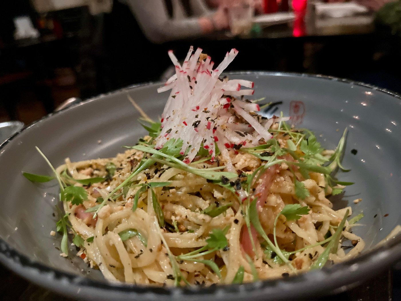 We loved everything we ordered — from corn ribs (now out of season) to a fresh, deeply umami daikon pad thai to crisp smashed potatoes smothered in a zippy horseradish aioli and fried chicken in a steamed bun (you know, for balance).