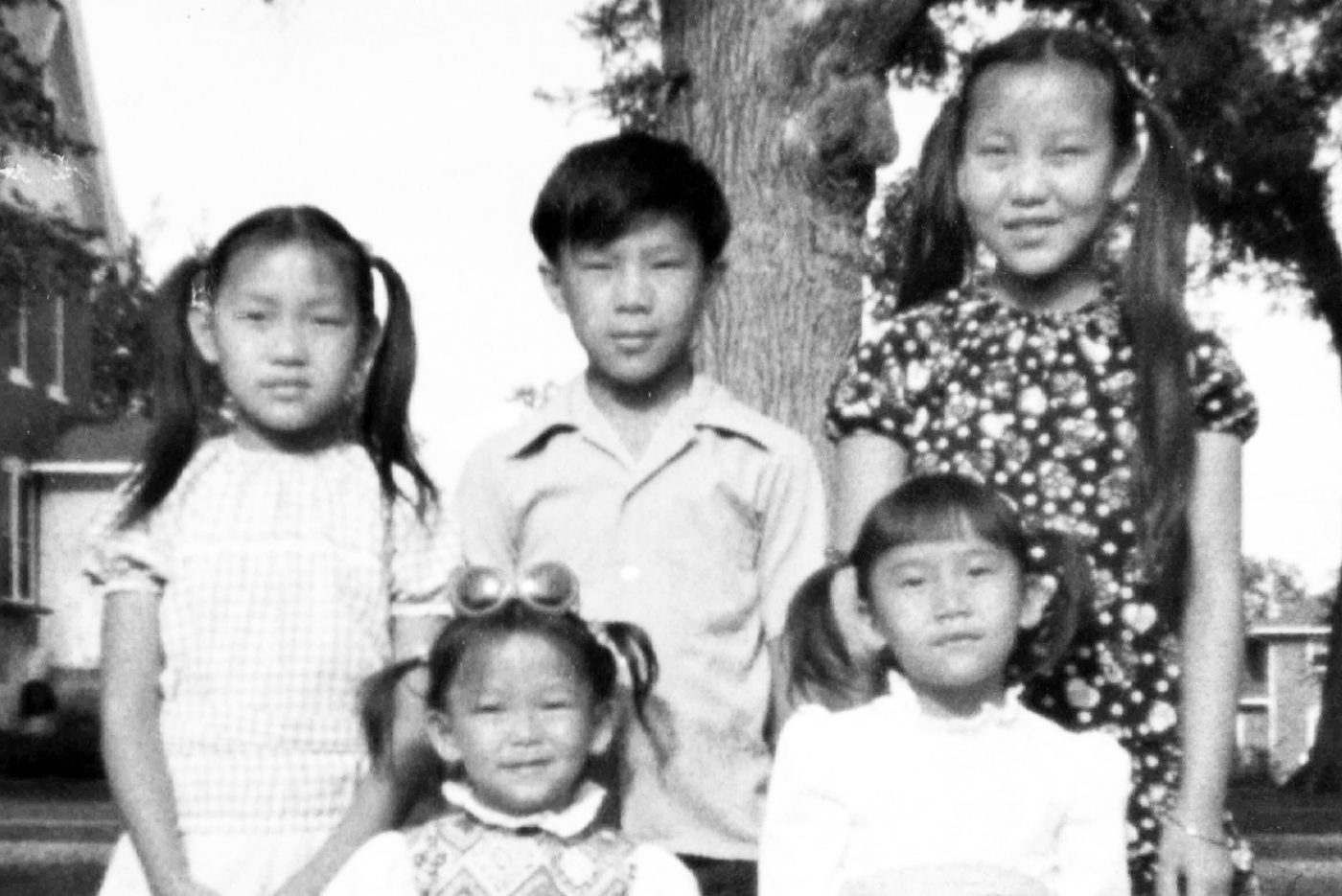 An undated black and white courtesy photo of the Thao siblings in Sparta, Wis., their first home in America. Back row, from left: May la, Yia, Gao Sheng. Front from left: Round Moon and Good Xai. (Courtesy of the Thao Family)