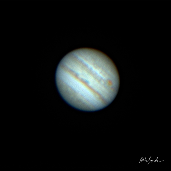 Jupiter, like Saturn, is a wonderful telescope target, even if you have a small scope. It’s basically a tremendously large ball of mostly hydrogen and helium gas, over 300 times more massive than Earth. In fact, Jupiter is twice as massive as all of the other planets combined. Like the rest of the gas giants in the outer solar system, it doesn’t have a solid surface but is thought to have a rocky core about 10 to 15 times the mass of the Earth. Because of its colossal mass, Jupiter has a very strong gravitational field, so strong that even if the planet had a surface to stand on, you wouldn’t be standing there long. The gravity of Jupiter would break you down to a pile of flesh and broken bones very quickly.