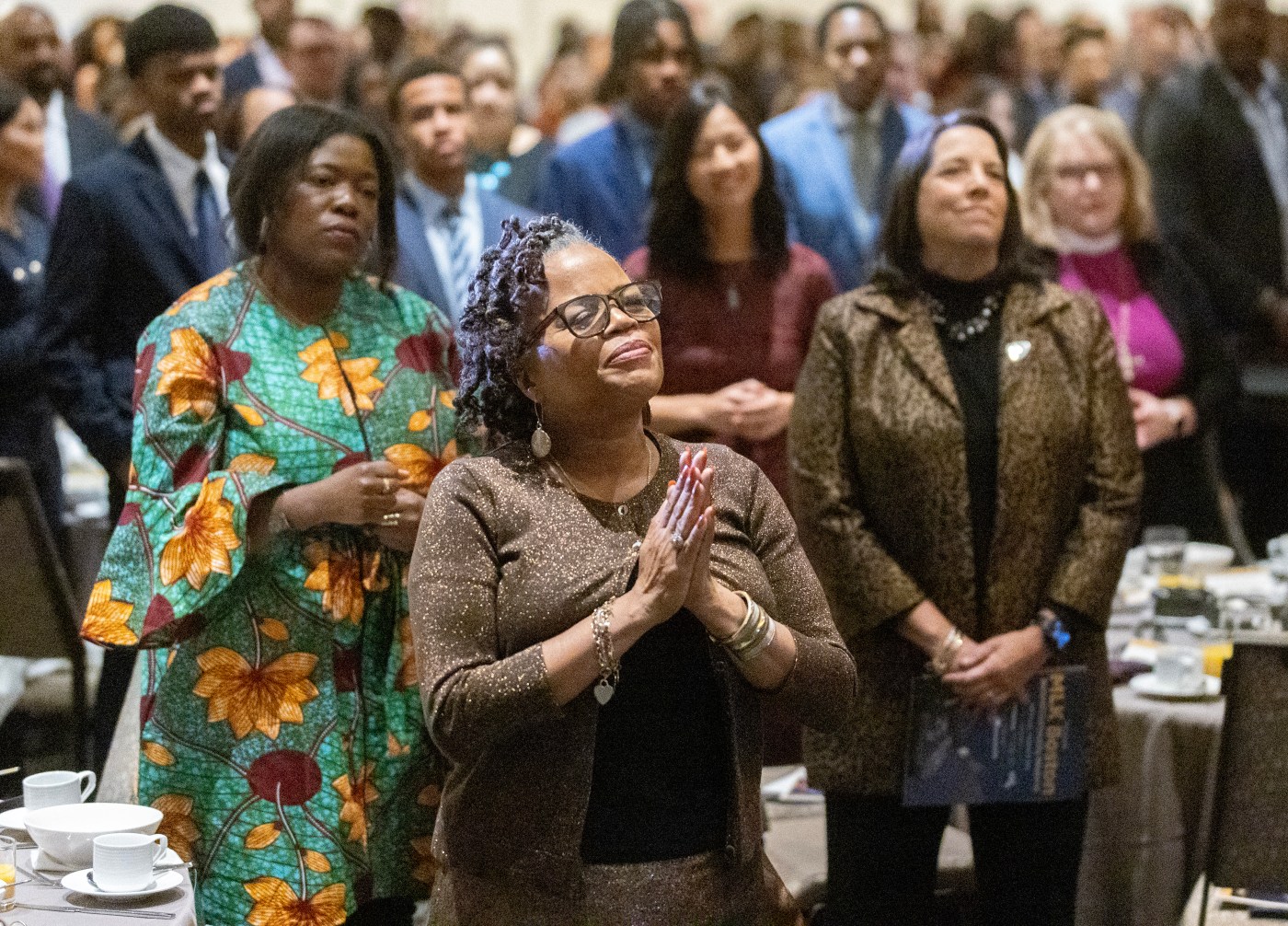 Attendees bow their heads in prayer during Monday’s 56th Annual MLK Breakfast. (Photo By Matt Stone/Boston Herald).