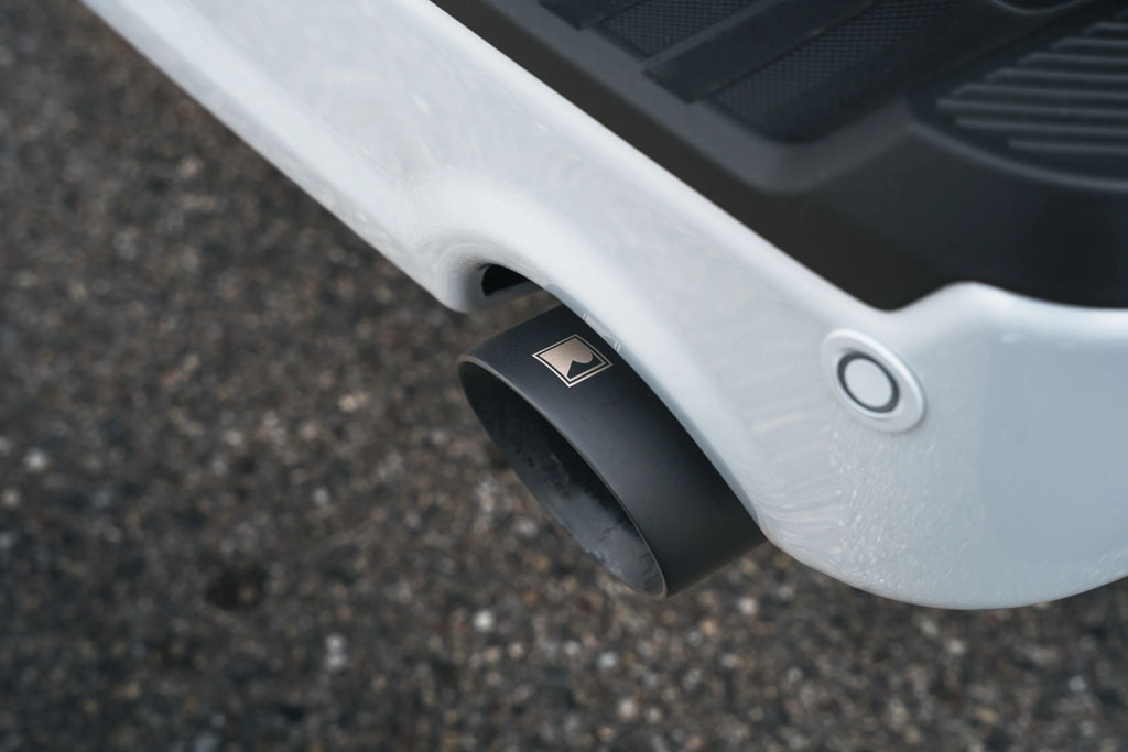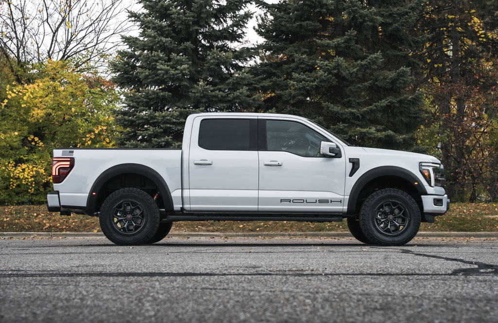 Inside, Roush keeps things subtle but special in the way enthusiasts usually prefer. You get aluminum pedal covers, a serialized dash badge, custom molded floor liners, and Roush touches that show up on the key fobs, hitch cover, and puddle lamps. Step up to the Premium Package and the truck gets even more utility-forward, adding amber auxiliary lighting up front and white lighting out back, along with an active exhaust system for the cat-back. There’s also an overhead auxiliary switch panel for your accessories, and carbon-fiber trim to elevate the cabin, with interior themes offered in Coffee Brown and Black or Raven Black.