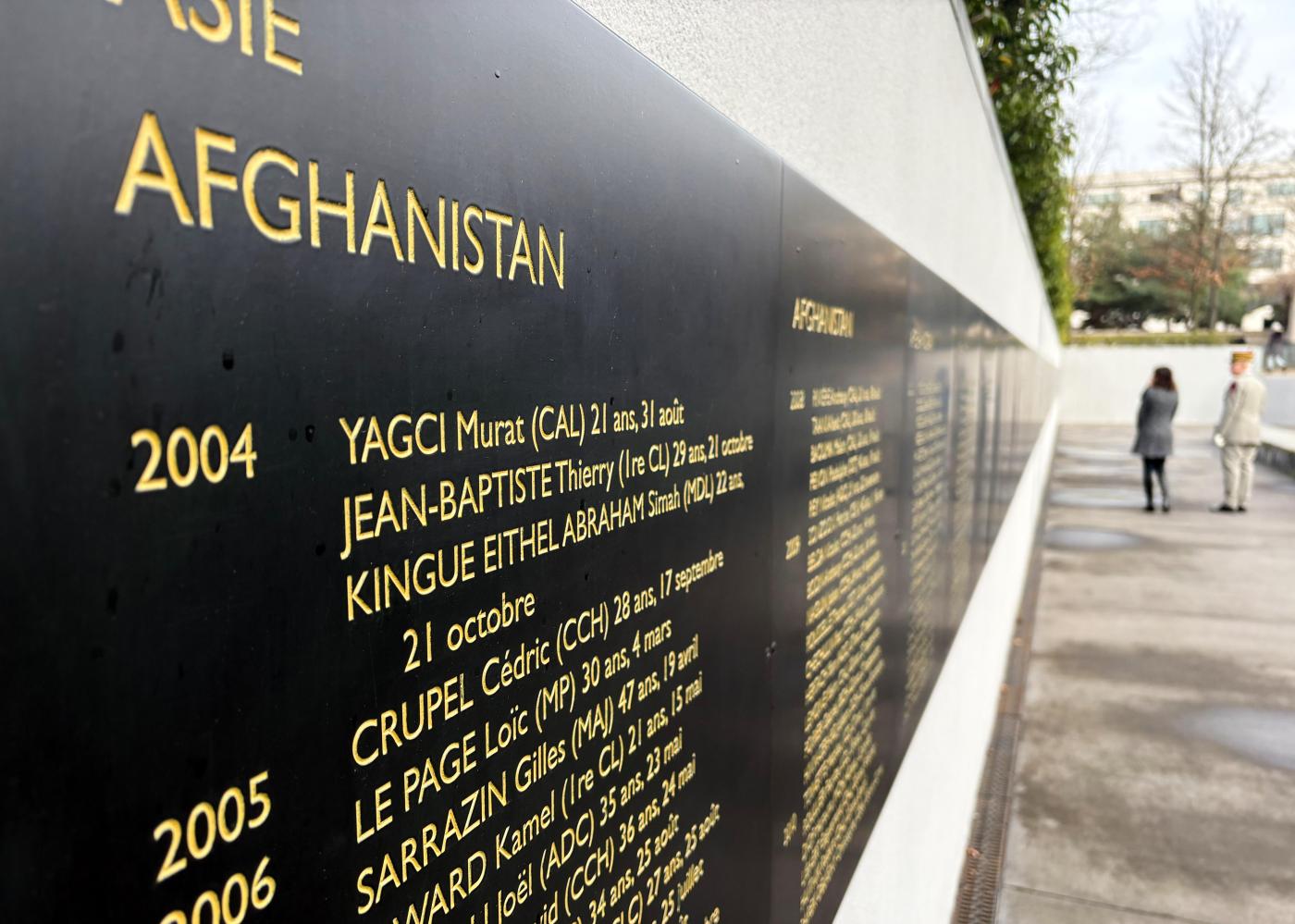 Alice Rufo, a deputy French defense minister, and Gen. Loic Mizon, the military governor of Paris, inspect the names of French troops killed in NATO operations in Afghanistan, where they fought with U.S. and other allied forces, during a visit Monday, Jan. 26, 2026, to a memorial in Paris for French troops killed in operations overseas. (AP Photo/John Leicester)
