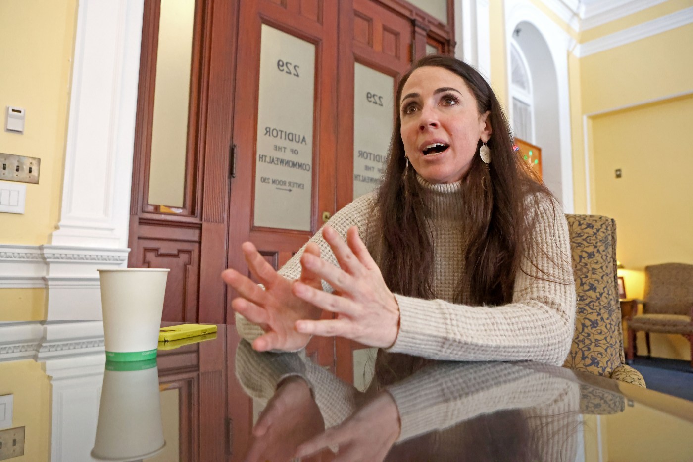State Auditor Diana DiZoglio speaks to the Herald from her office at the State House. (Staff photo by Stuart Cahill/Boston Herald)