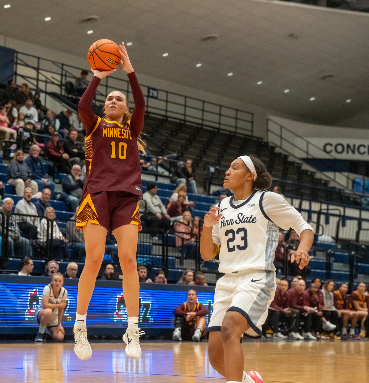Tori McKinney led the Gophers with 23 points, while Mara Braun recorded 22 points in an 87-66 defeat of the Nittany Lions. Four of five Minnesota starters recorded double digits in scoring, with Sophie Hart and Amaya Battle logging 12 points apiece. Battle also led all rebounders with 10 boards.