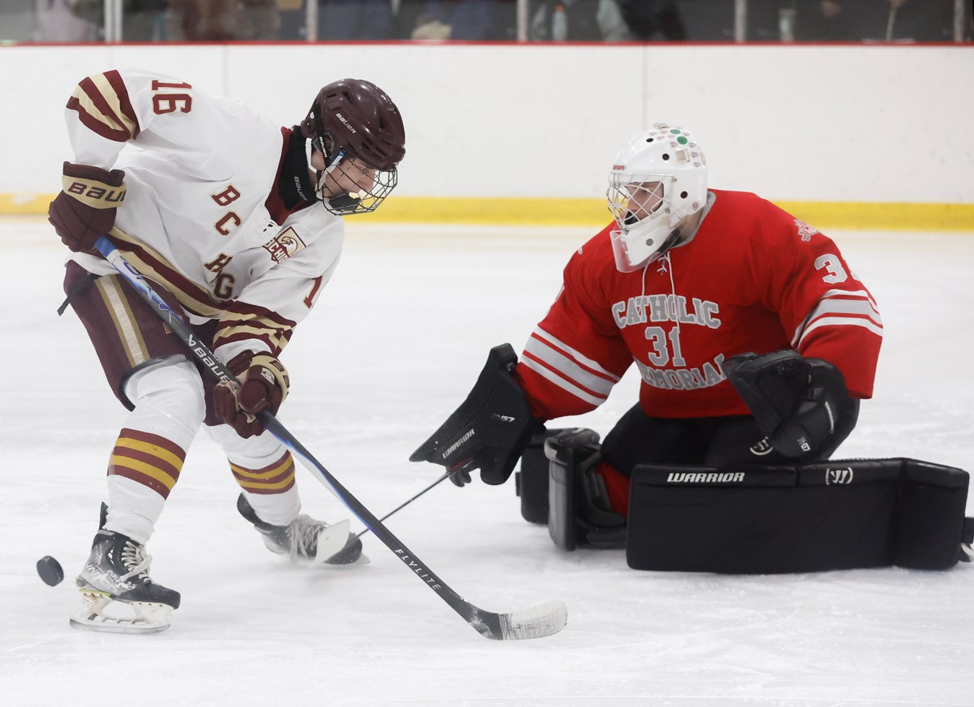 Then, CM (13-2-1) found its rhythm and seized control. With 4:47 to play in the opening period, Carlson collected a rolling puck in front of the BC High net, then sniped twine as the Knights took an early 1-0 lead.