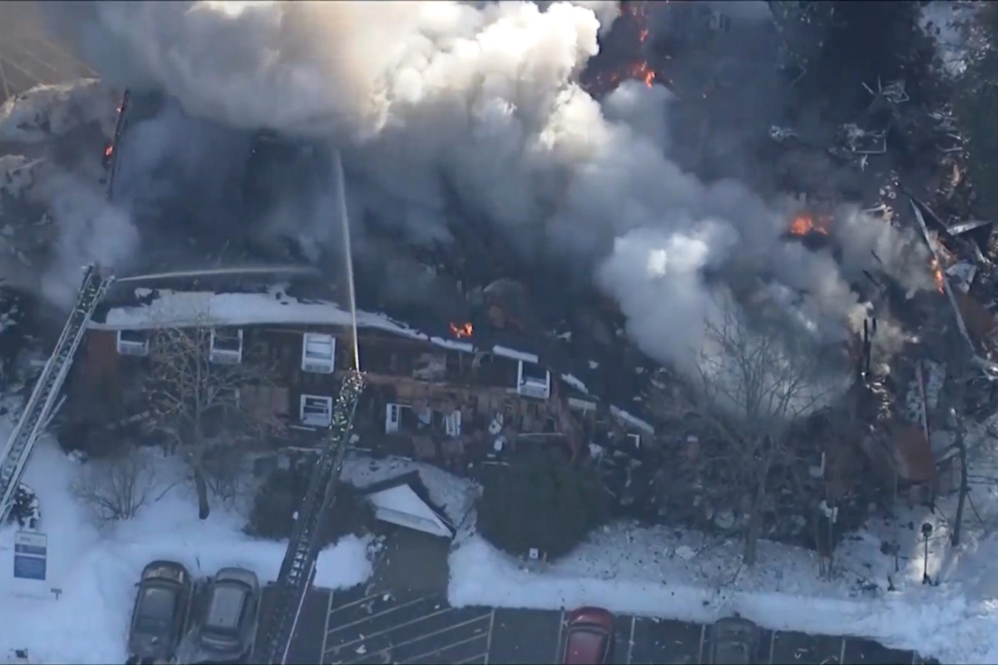 The blast appeared to have obliterated at least part of the building, with aerial footage from WCBV-TV showing flames and smoke billowing from the rubble. Bits of wreckage appeared to be scattered in the snow and a parking lot in front of the facility.