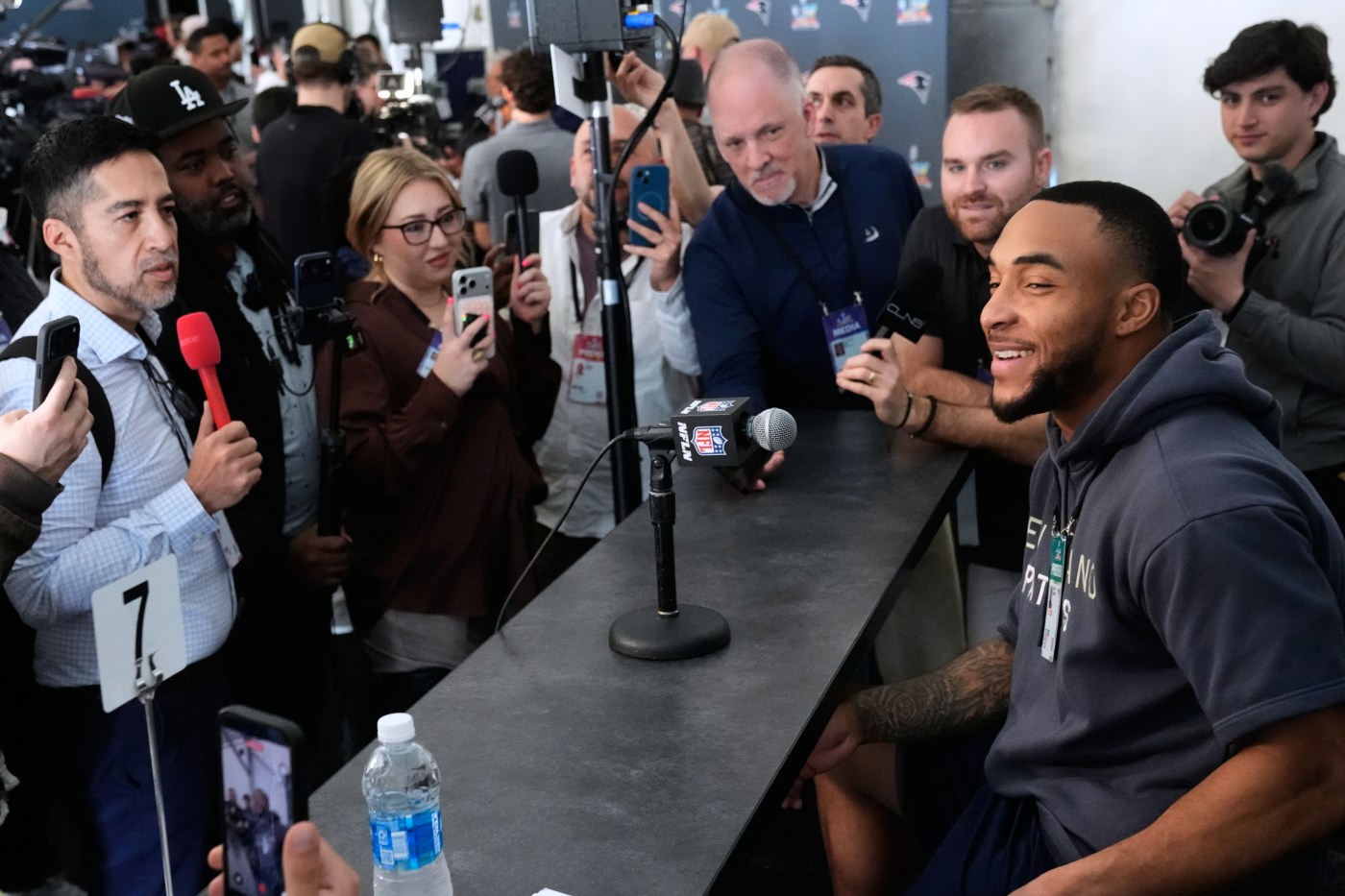 Players were off Tuesday, so the team and league obligated nine players to speak to reporters. Chaisson also volunteered, so the Patriots set up a 10th podium.