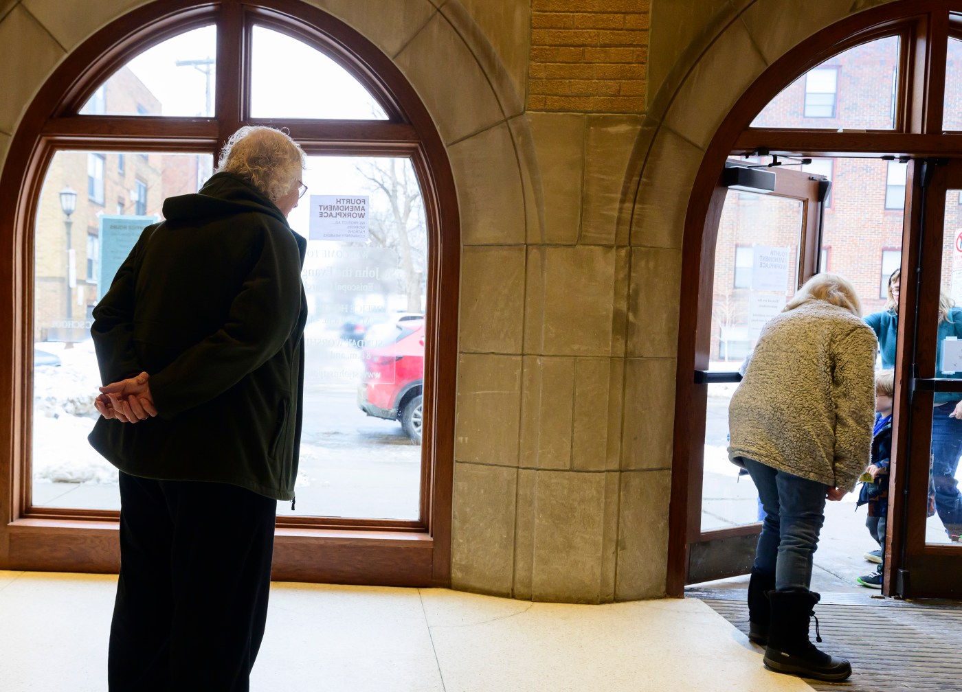 St. John’s Episcopal Church offers whistles and advice on alerting the community to ICE activity in St. Paul on Thursday, Feb. 5, 2026. (John Autey / Pioneer Press)