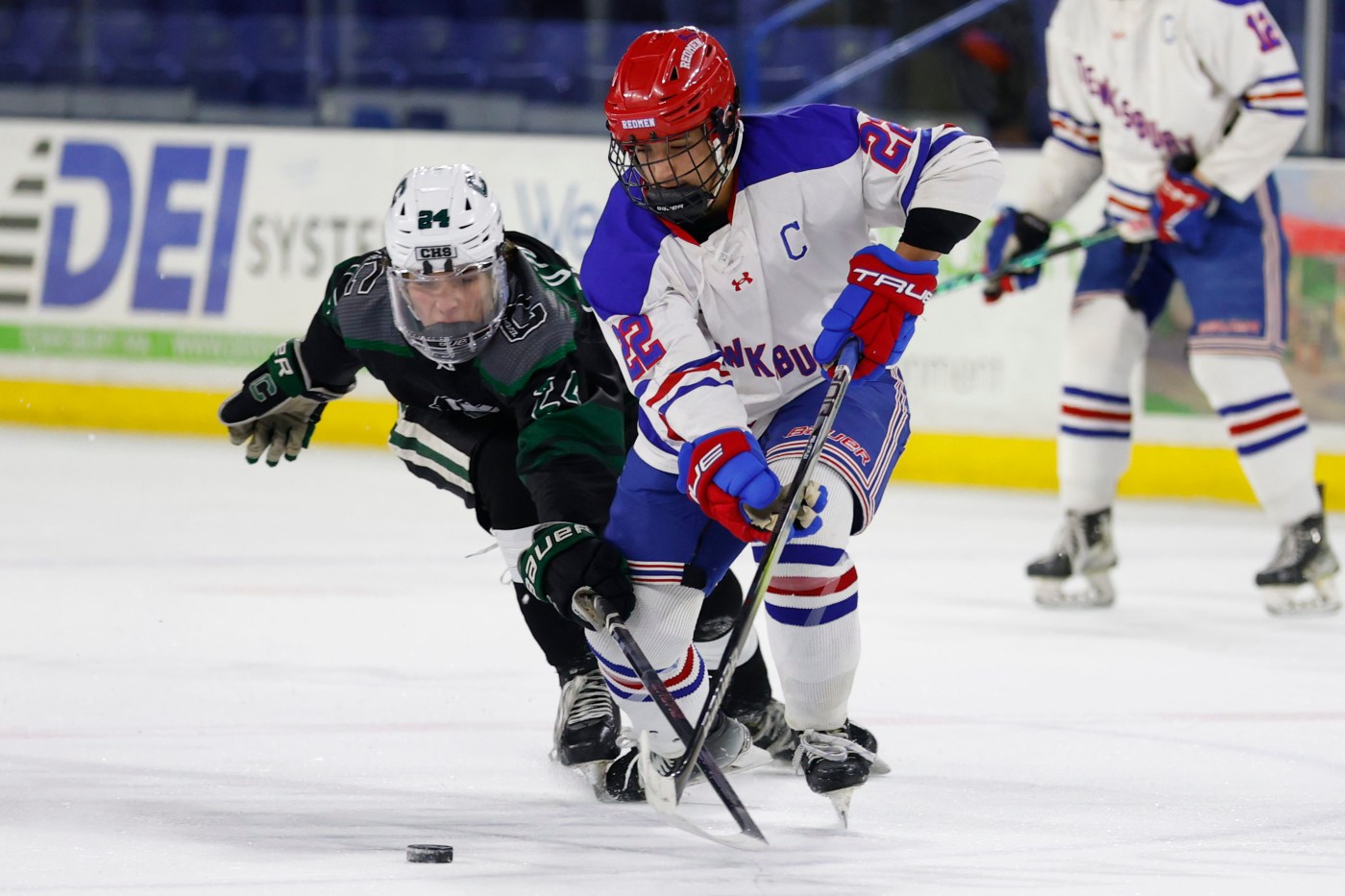 Canton’s Cullen O’Brien, left, skates by Tewksbury’s Jake Cunha on Sunday at the Tsongas Center in Lowell. (CJ Gunther/Boston Herald)