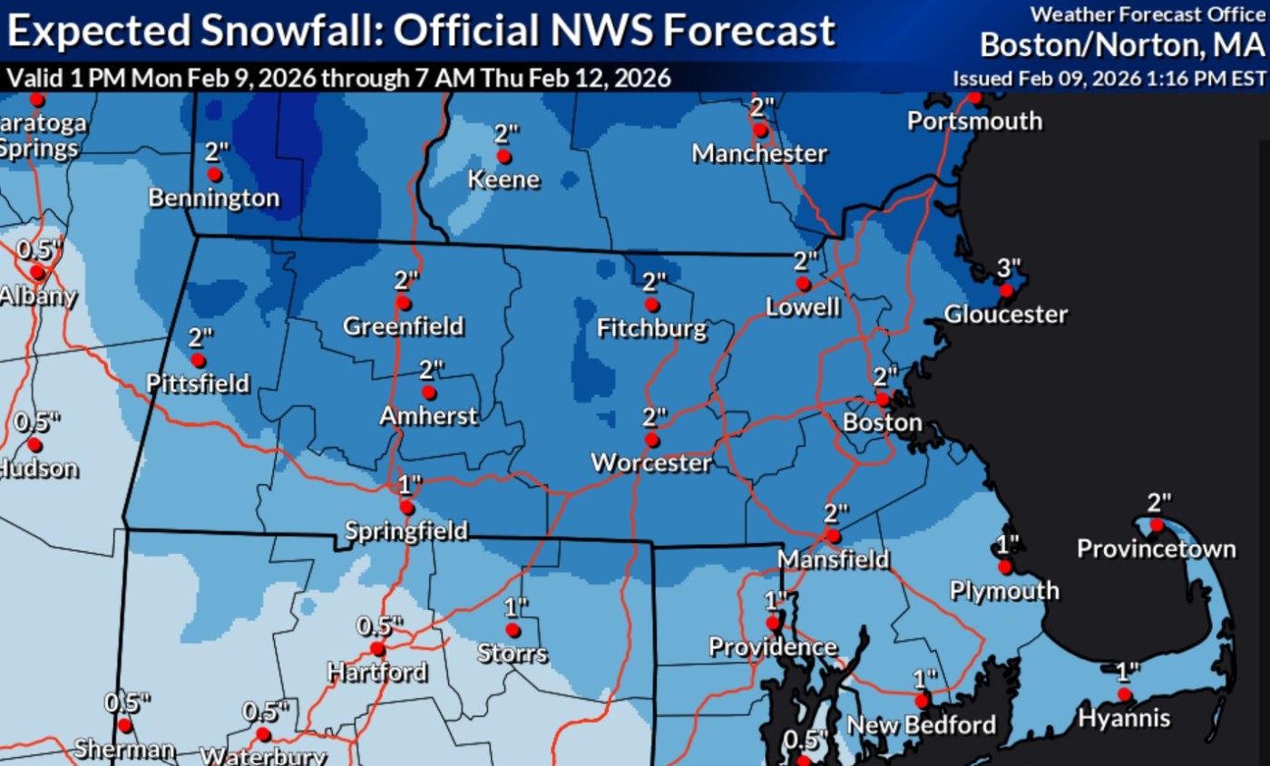 “It looks like we’re expecting in the 2- to 3-inch range for Boston with this clipper system,” National Weather Service meteorologist Kyle Pederson told the Herald.