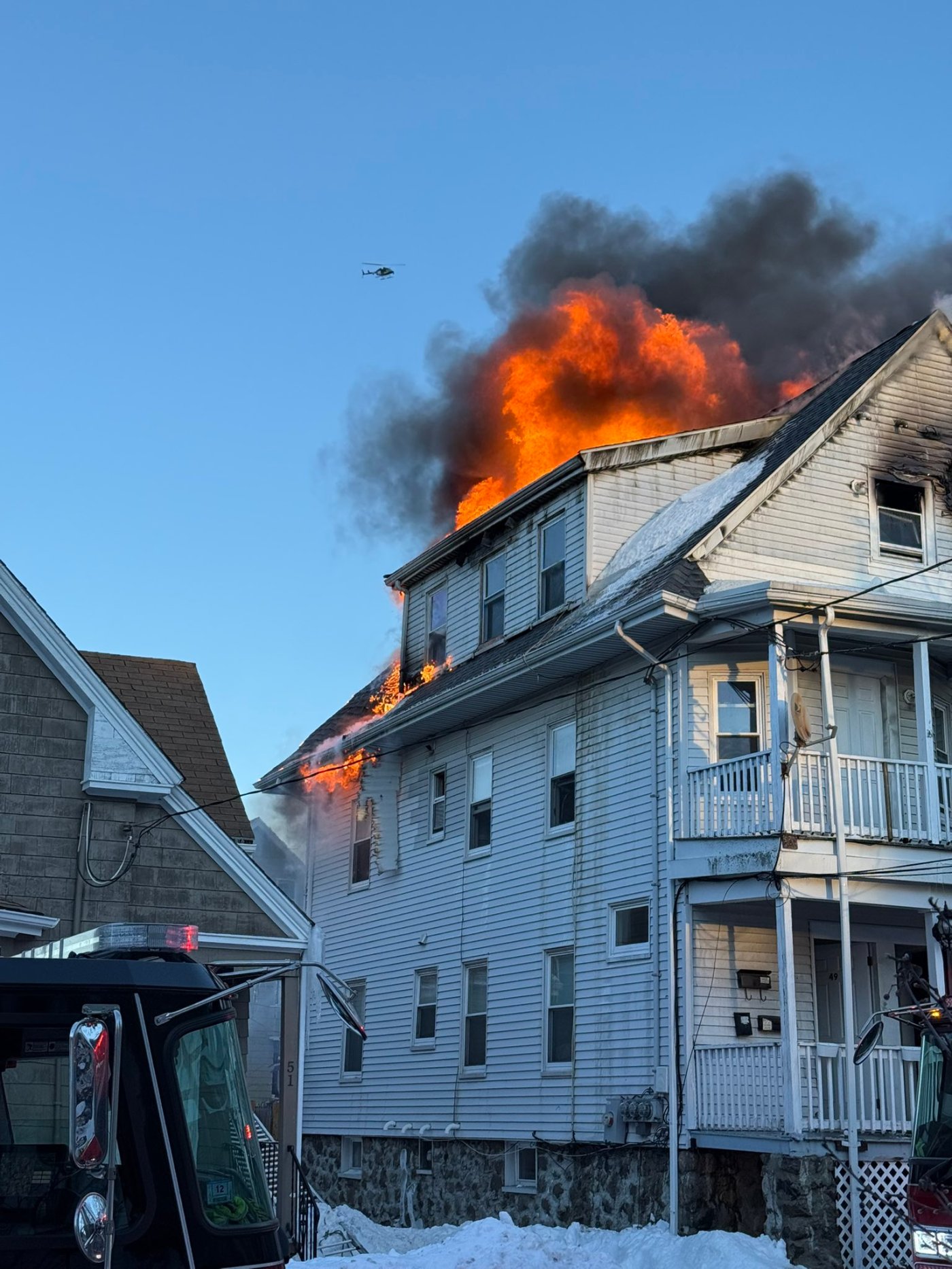 The fire had “possession of the third floor” quickly after it began, with flames shooting through the roof of the building, the Lynn Fire Department posted on social media. It was initially reported as a “porch fire with heavy fire showing.” There were no injuries.