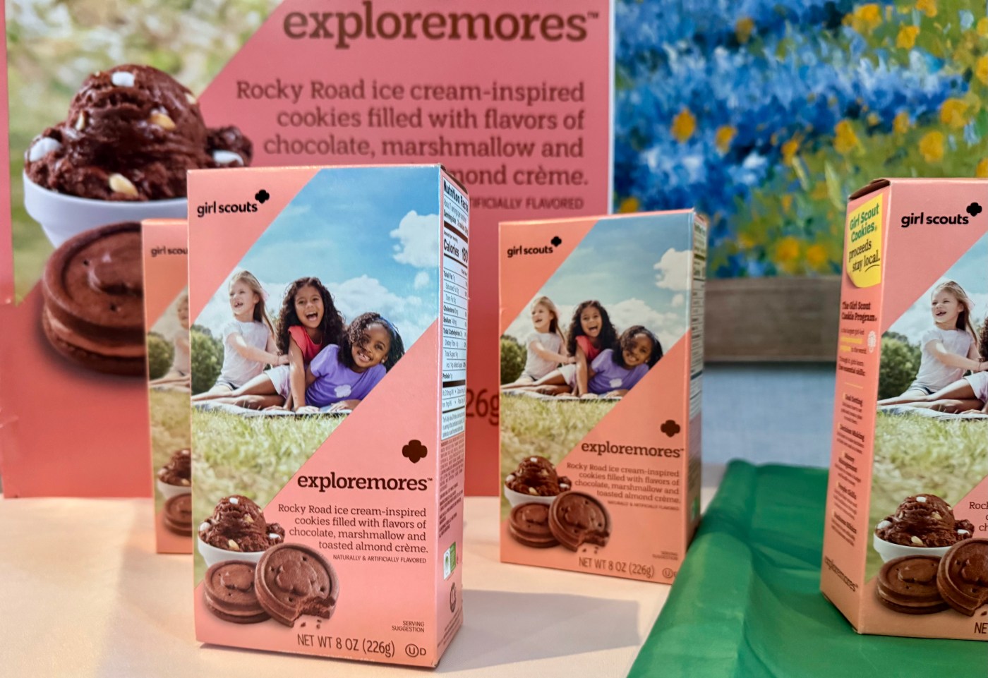 Girl Scouts with the new 2026 Exploremores cookies. The organization anticipates that many of its members will opt to sell cookies online instead of the traditional door-knocking method this year. (Courtesy of Girl Scouts)