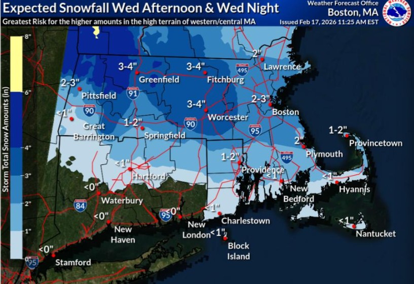 “Travel will likely be impacted Wednesday afternoon and Wednesday night due to low visibility at times and snow covered roads,” NWS Boston wrote in its advisory for central and western Mass.