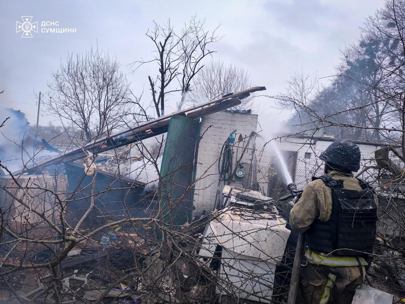In this photo provided by the Ukrainian Emergency Service, firefighters put out the fire in private houses following a Russian air attack in Sumy region, Ukraine, Tuesday, Feb. 17, 2026. (Ukrainian Emergency Service via AP)