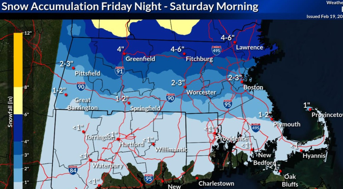 Up to 6 inches of snow is possible in northern Mass., while around 2 to 3 inches of snow is expected in the Boston-area.