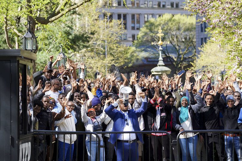 Una manifestación frente al Ayuntamiento de Nueva York en 2024, antes de una audiencia del Consejo sobre las experiencias de los inmigrantes negros recién llegados. (Gerardo Romo / NYC Council Media Unit)