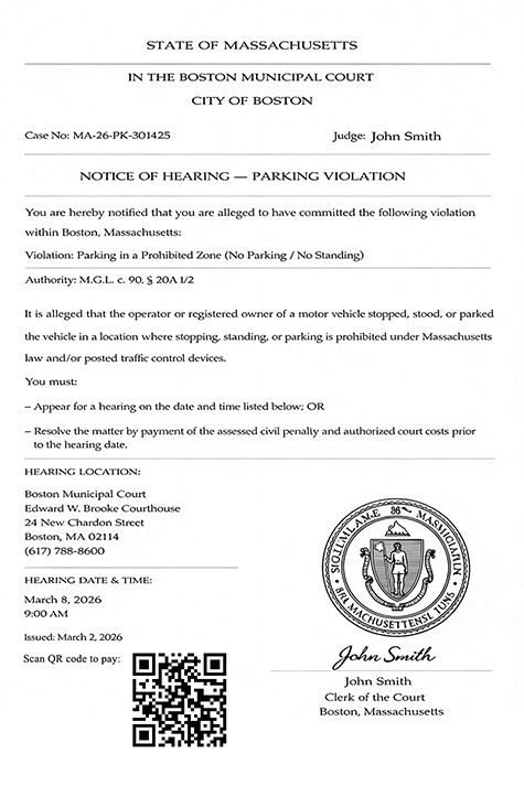 The fraudulent notes may have a case number, a judge’s name, a hearing date, and even a Boston Municipal Court address and Commonwealth seal.
