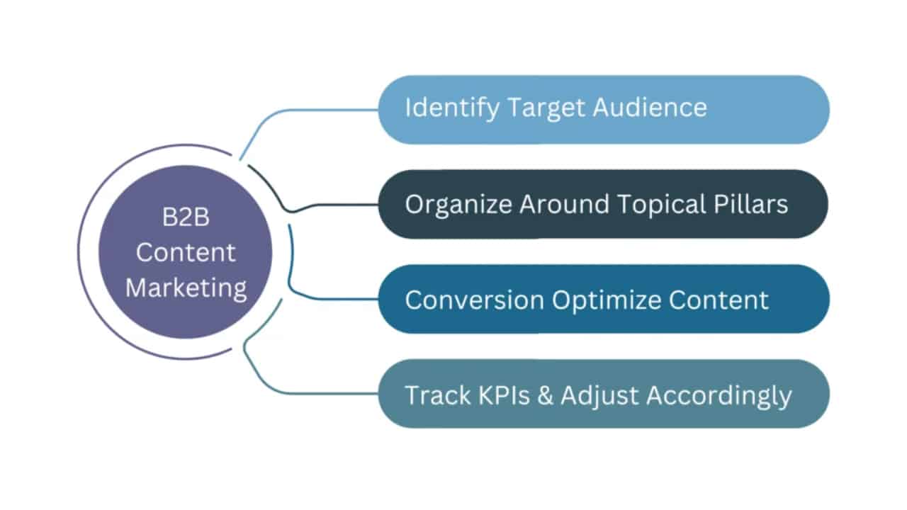 In simple terms, B2B content marketing means Business-to-Business content marketing, which involves all the steps that a marketer uses to grow their business. It includes writing content, making videos, and promoting businesses on social media like LinkedIn, which eventually leads to growth and sales.