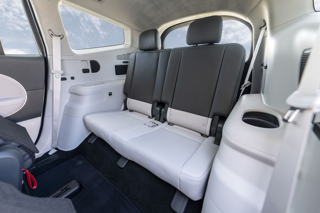 Hyundai went the distance as they always do for the interior space of the new Ioniq 9, which takes somewhat of a page from its other SUVs. However, in the top-level AWD Performance Calligraphy Design trim, the Ioniq 9 is quite the inviting luxurious space with a microfiber suede headliner, ventilated and heated front and second-row seats, massaging function through the Ergo Motion driver’s seat, heated and power tilt-telescoping steering wheel, color-selectable LED ambient lighting, several soft touch surfaces throughout, and 21-inch wheels. While not fully on the spectrum of being a luxury vehicle, the Ioniq 9 Calligraphy Design trim does well with its whisper-quiet cabin and plush accoutrements.
