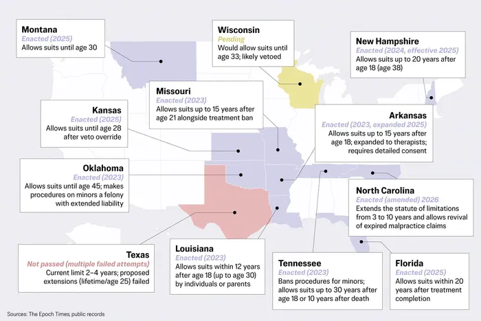 Florida passed a law in 2025 that extends the tort deadline for such cases to 20 years after the cessation or completion of the sex-reassignment prescription or procedure. Last year, Montana also extended its deadline to file legal claims until age 30.