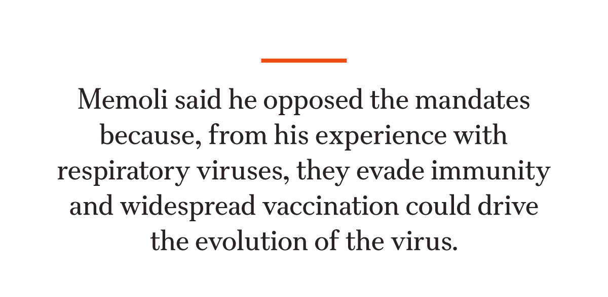 Memoli, in comments to reporters and in internal emails, said he opposed the mandates because from his experience with respiratory viruses, they evade immunity, and vaccines could drive the evolution of the virus. He also said requiring shots infringed on medical freedom.